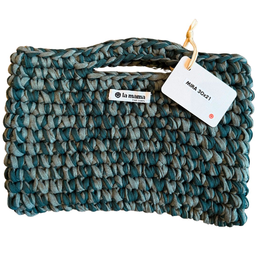 Diese stylische Tasche vereint Trend und Nachhaltigkeit auf einzigartige Weise: Sorgfältig von Hand gefertigt in der Farbe Grün, besteht sie aus recyceltem T-Shirt-Garn und trägt so aktiv zur Reduzierung von Textilabfällen bei.