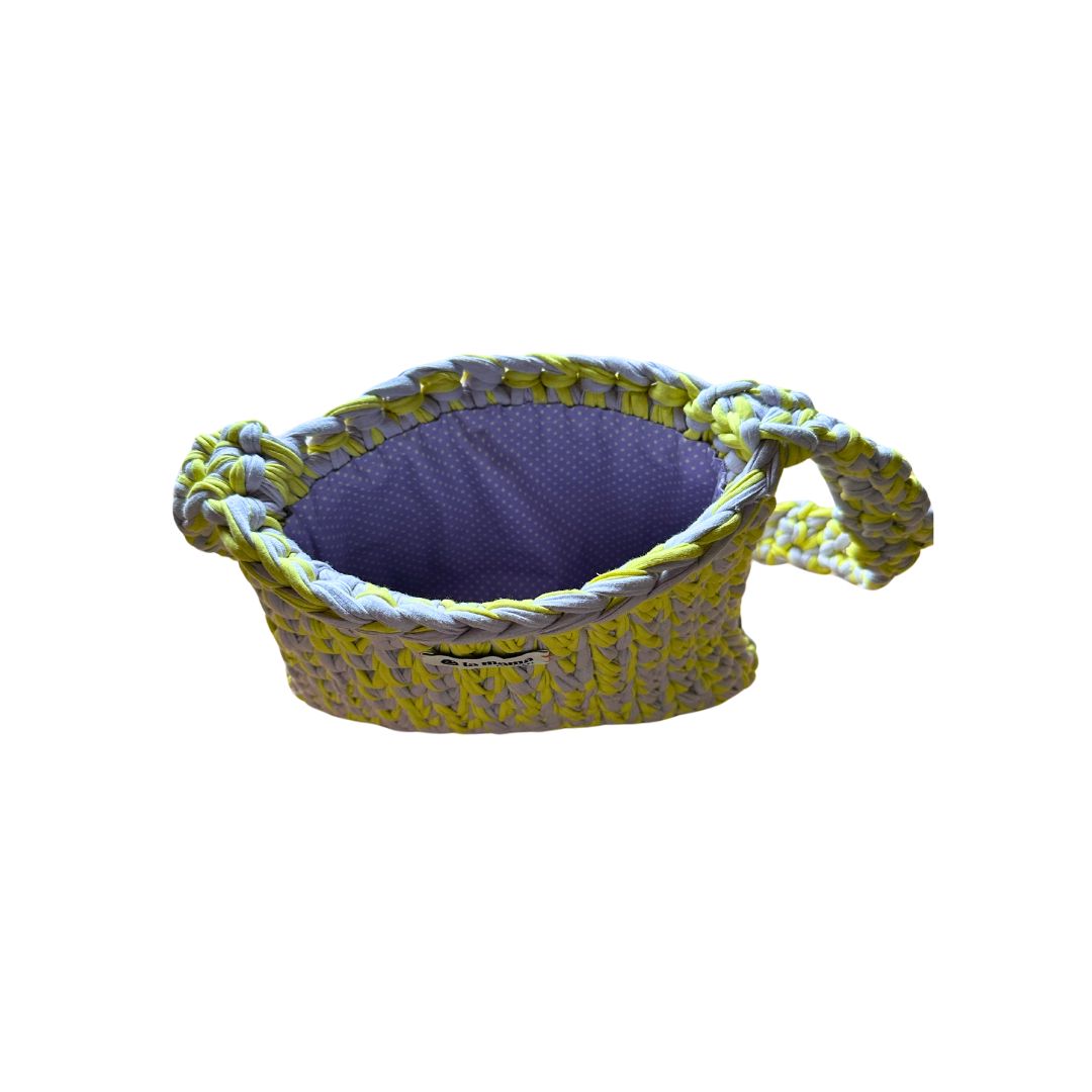 Diese stylische Tasche vereint Trend und Nachhaltigkeit auf einzigartige Weise: Sorgfältig von Hand gefertigt in den Farben Flieder und Gelb, besteht sie aus recyceltem T-Shirt-Garn und trägt so aktiv zur Reduzierung von Textilabfällen bei.